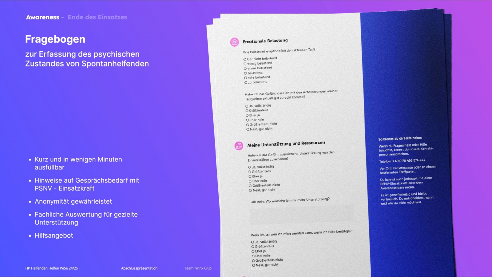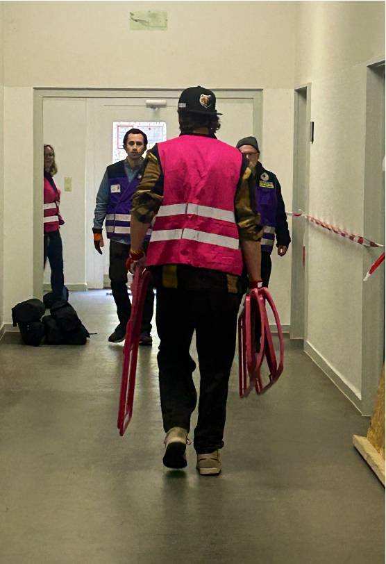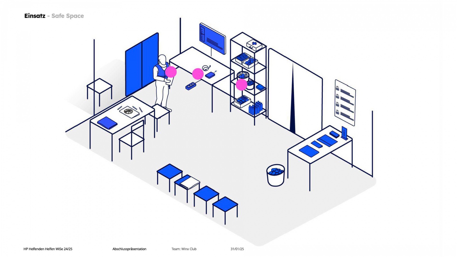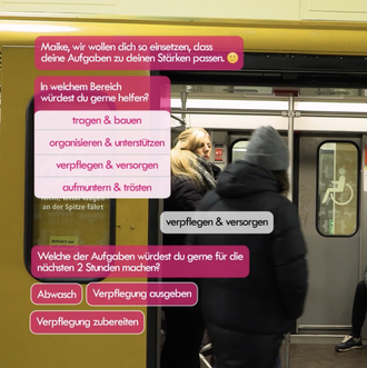 Ein Semester lang haben sich die Studierenden damit beschäftigt, wie Spontanhelfende in Krisensituationen wie Hochwasser oder Evakuierungen sicher und effektiv eingebunden werden können. Dabei arbeiteten sie mit dem Deutschen Roten Kreuz und dem Forschungsprojekt KatHelfer-PRO zusammen. Durch den Einsatz von Service-Design-Methoden wurden die Bedürfnisse der Helfenden und Handlungsfelder analysiert sowie Lösungsansätze entwickelt, die eine effiziente Unterstützung durch Spontanhelfende fördert und Überlastungen erkennt.