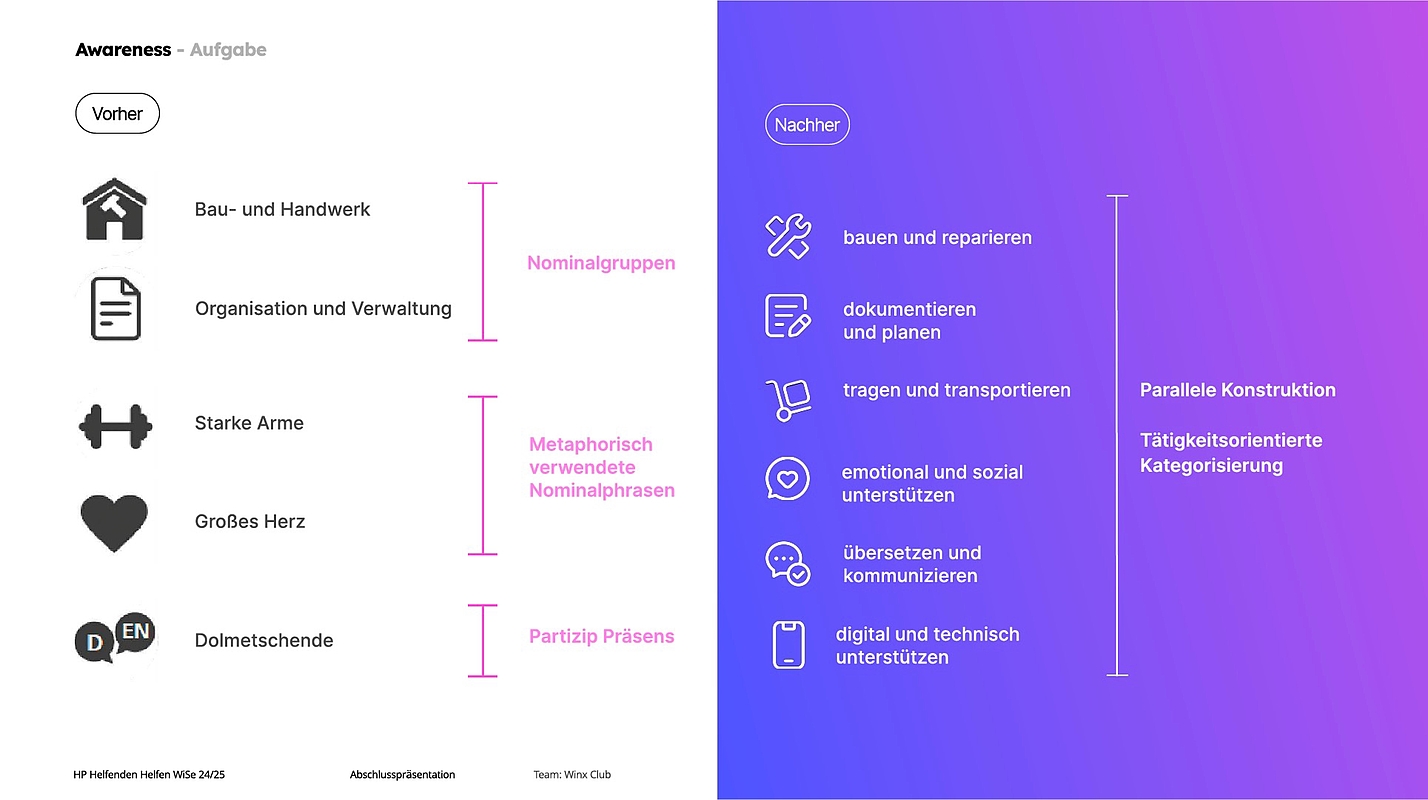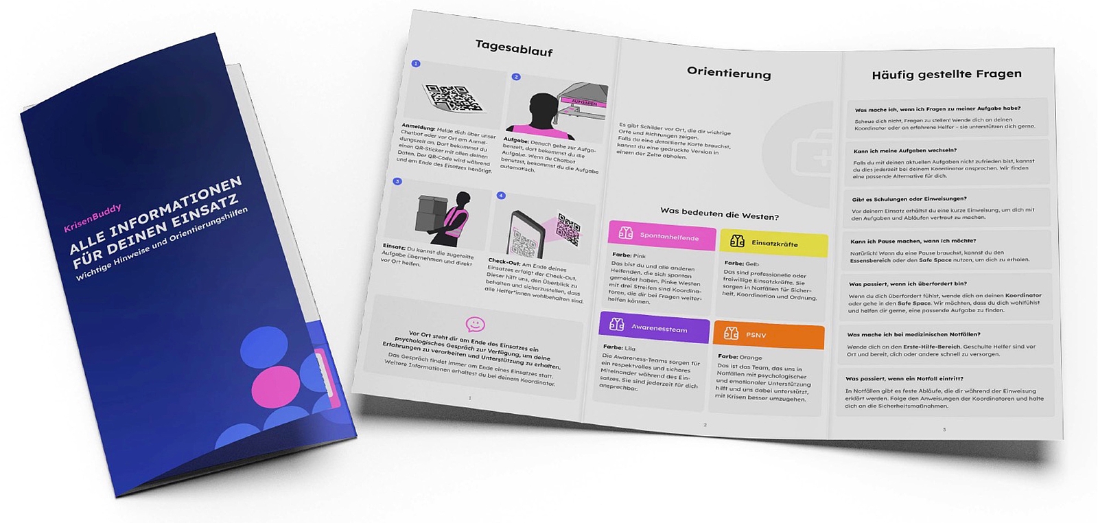 Mithilfe von Service-Design-Methoden wurden die Bedürfnisse von Spontanhelfenden untersucht. Im Rahmen einer Katastrophenschutzübung zu Beginn des Semesters konnten die Studierenden wertvolle Einblicke gewinnen, die in einer Dokumentation und Auswertung ihrer gesamten User Journey mündeten. Dadurch konnten folgende Handlungsfelder identifiziert werden: Kommunikation vor Ort, Diversität und Gleichstellung, das Wohlbefinden der Helfenden, die Usability des Chatbots und die Bekanntmachung von Spontanhilfe. Dabei stellten sie fest, dass viele Ideen an den Silostrukturen des Bevölkerungsschutzes in Deutschland scheitern, und hinterfragten konsequent, was aus Sicht der Spontanhelfenden sinnvoll wäre.